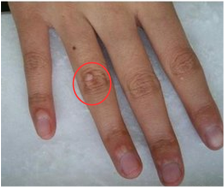寻常疣好发于手指、手背、足缘等处。初起为针尖大的丘疹,渐渐扩大到豌豆大或更大,呈圆形或多角形,表面粗糙,角化明显,质坚硬,呈灰黄、污黄或污褐色。数目不等,初起多为一个,以后可发展为数个到数十个。一般无自觉症状,偶有压痛。