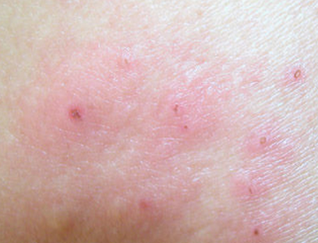 4、接触性皮炎轻症时局部呈红斑,淡红至鲜红色,稍有水肿,或有针尖大丘疹密集,重症时红斑肿胀明显,在此基础上有多数丘疹、水疱,炎症剧烈时可以发生大疱。水疱破裂则有糜烂、渗液和结痂。